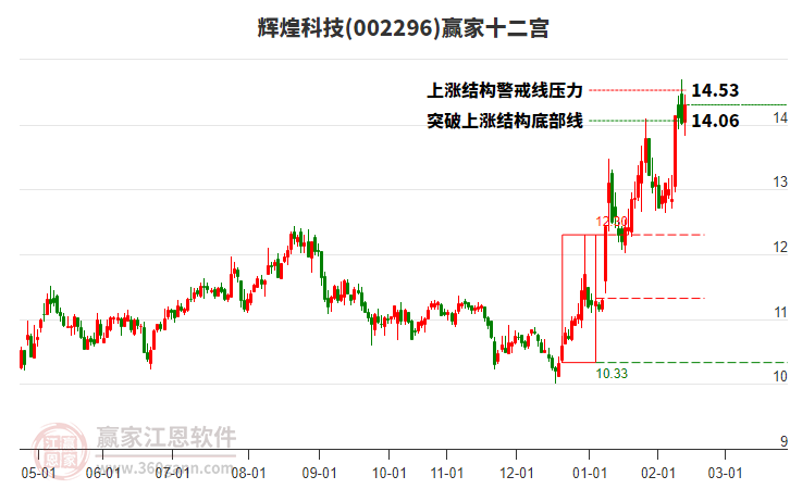 002296輝煌科技今天,以強(qiáng)勢漲停收盤,近30個交易日漲幅18.49%,當(dāng)前K線上穿前方上漲結(jié)構(gòu)頂部