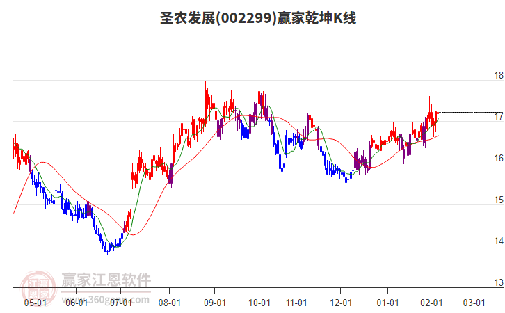 圣農(nóng)發(fā)展002299上漲遇阻 受藍色外軌線壓制 以中陽線收盤