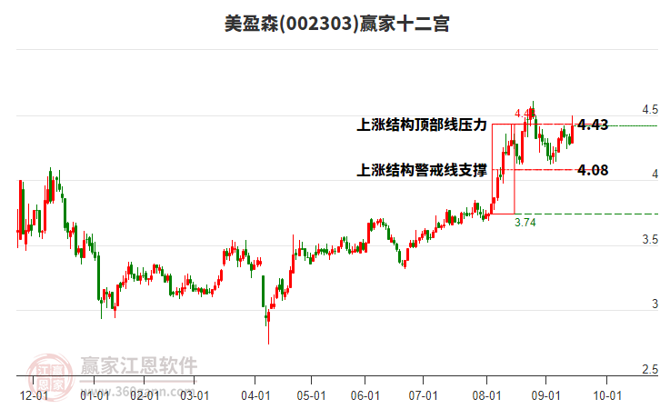 002303美盈森根據(jù)贏家江恩極反通道趨勢工具展示,上方壓力位4.6052,下方支撐位4.1971。002303美盈森處于贏家江恩多頭主線形態(tài),從12月17日形成底分型后持續(xù)上攻,今日突破前高形成初次