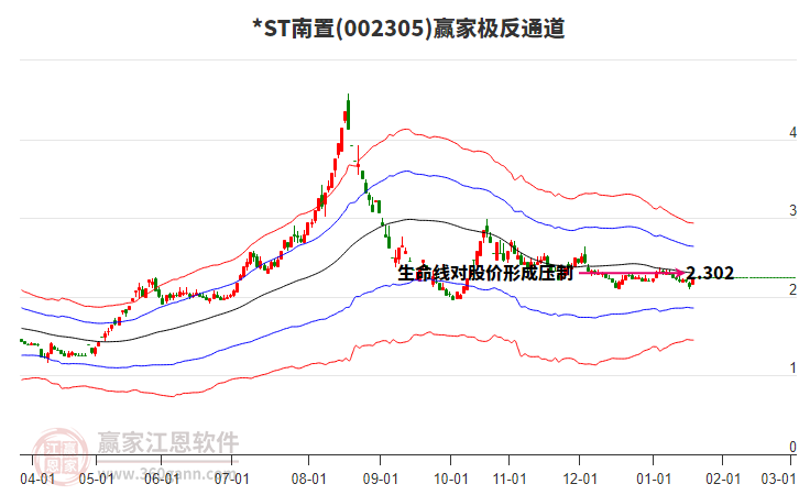 依據(jù)贏家江恩系統(tǒng)趨勢工具極反通道分析判斷南國置業(yè)002305運行在生命線以下弱勢區(qū)域,根據(jù)規(guī)則該股短線輕倉參與,股價跌至弱勢外軌線后波段再結(jié)合其它工具信號建倉。應(yīng)用口訣是:生命線上強勢走,生命線下難抬頭;紅黃兩條外軌線,壓力支撐顯勢頭。
