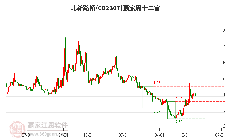 002307北新路橋處于贏家江恩多頭次主線形態(tài),從1月23日形成頂分型后持續(xù)下跌,重心下移,今日跌破前低形成短期初次筑頂信號,短期多頭趨勢已被破壞,中長期目前都處于回調(diào)中。002307北新路橋根據(jù)贏家