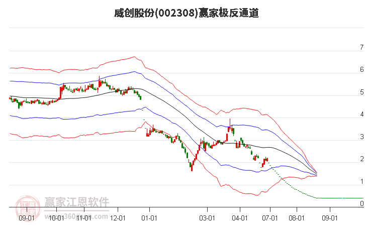 依據(jù)贏家江恩系統(tǒng)趨勢工具極反通道分析判斷威創(chuàng)股份002308運行在生命線以下弱勢區(qū)域,根據(jù)規(guī)則該股短線輕倉參與,股價跌至弱勢外軌線后波段再結合其它工具信號建倉。應用口訣是:生命線上強勢走,生命線下難抬頭;紅黃兩條外軌線,壓力支撐顯勢頭。