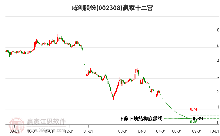 002308威創(chuàng)股份跳空低開收上影十字星,到達江恩價格循環(huán)線工具支撐位0.21元上