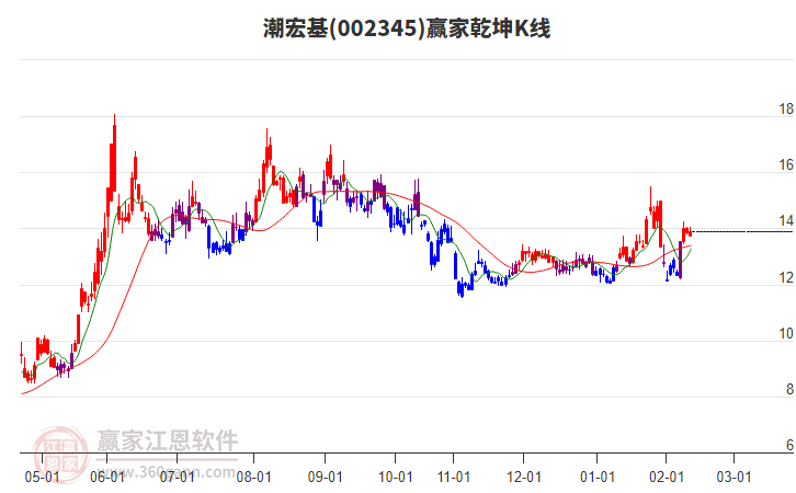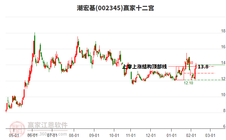 002345潮宏基低開收陽線,上穿贏家十二宮上漲結(jié)構(gòu)頂部線