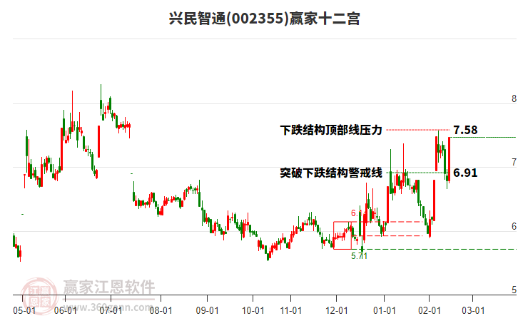2月13日股價上穿前期2025年4月9日形成的下跌結(jié)構(gòu)警戒線6.91,本輪上漲自前期低點2月12日,經(jīng)歷1日漲至今日7.47,漲幅12.33%。依據(jù)贏家十二宮多空能量守恒規(guī)則,下跌結(jié)構(gòu)警戒線是多空能量平衡點,突破或跌破往往意味著平衡打破。 今日突破警戒線,多方能量主導上攻,有望在下跌結(jié)構(gòu)頂部線7.58附近將會形成新的多空能量平衡位。