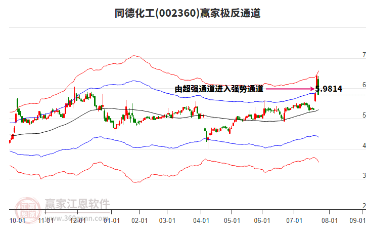 當天002360同德化工最高價5.95上穿了贏家極反通道工具藍色外軌線,受到藍色外軌線強力壓制,最終收盤停留在在藍色外軌線與生命線上方的強勢通道區(qū)域。002360同德化工近10個交易日漲幅11.46%