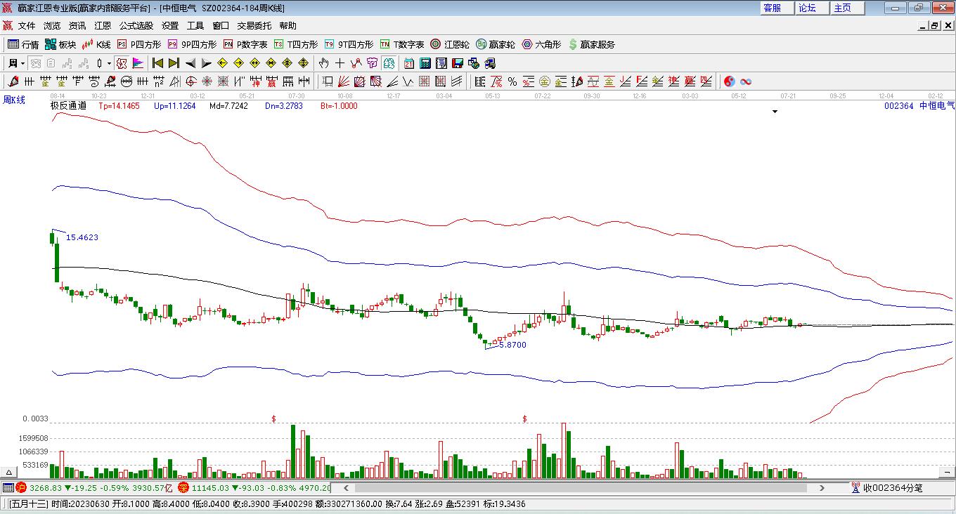 002364中恒電氣處于贏家江恩多頭主線形態(tài),2月2日發(fā)出江恩筑頂信號后,經(jīng)過2日,今日再次發(fā)出江恩底分型并發(fā)出江恩筑底信號,中長期多頭趨勢依舊保持。002364中恒電氣根據(jù)贏家江恩極反通道趨勢工具展