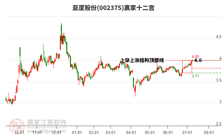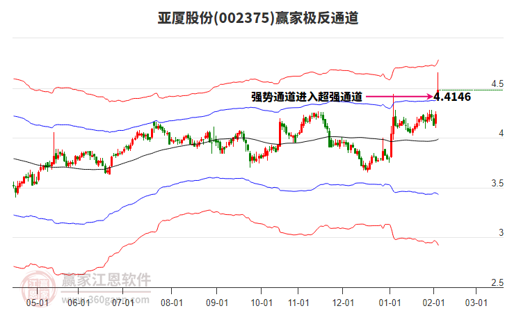 1月6日亞廈股份002375最高價4.44上穿了贏家極反通道工具藍色外軌線,受到藍色外軌線強力壓制,最終收盤停留在在藍色外軌線與生命線上方的強勢通道區(qū)域。亞廈股份002375近10個交易日漲幅10.5