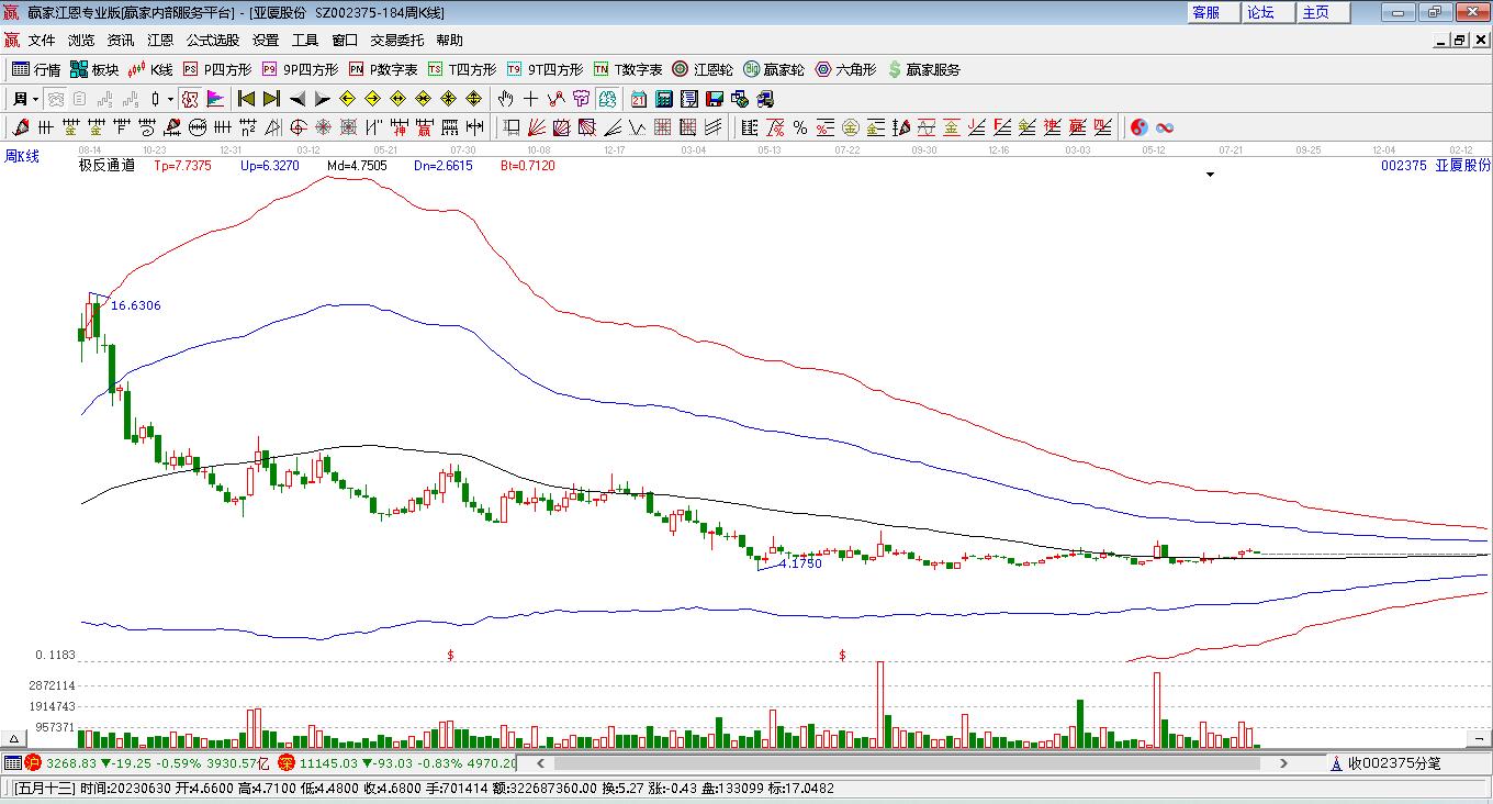 依據(jù)贏家江恩極反通道趨勢工具展示,本周股價(jià)處于生命線上強(qiáng)勢通道,本周收盤價(jià)4.26,自近期通道內(nèi)高點(diǎn)4.71持續(xù)下跌至本周,到達(dá)生命線3.8961點(diǎn)上方,短期關(guān)注此線支撐,如支撐不破,保持在強(qiáng)勢通道內(nèi),波段繼續(xù)看多,有望再次挑戰(zhàn)藍(lán)色上軌線。若跌破生命線3.8961,進(jìn)入弱勢通道,打開下跌空間。