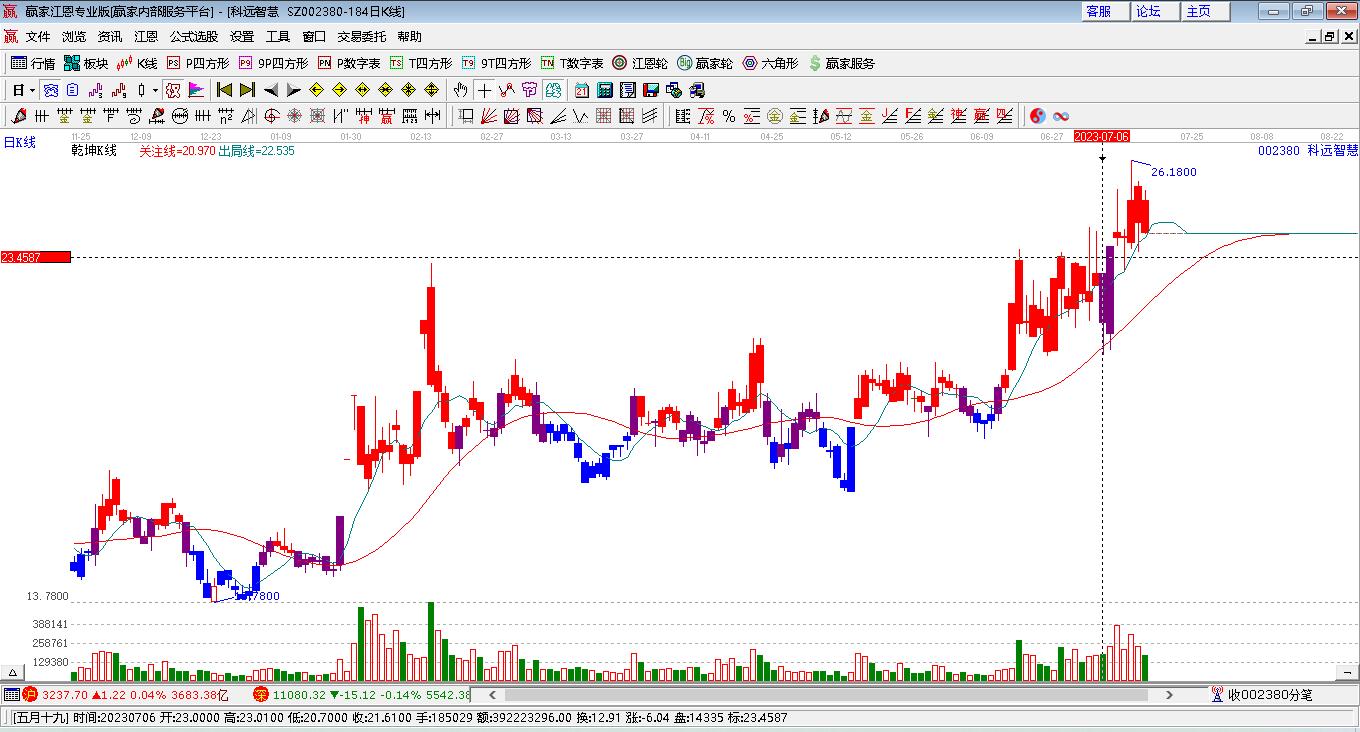 002380科遠智慧根據(jù)贏家江恩極反通道趨勢工具展示,上方壓力位27.914,下方支撐位23.9148。002380科遠智慧處于贏家江恩多頭主線形態(tài),從12月17日形成底分型后持續(xù)上攻,今日突破前高形