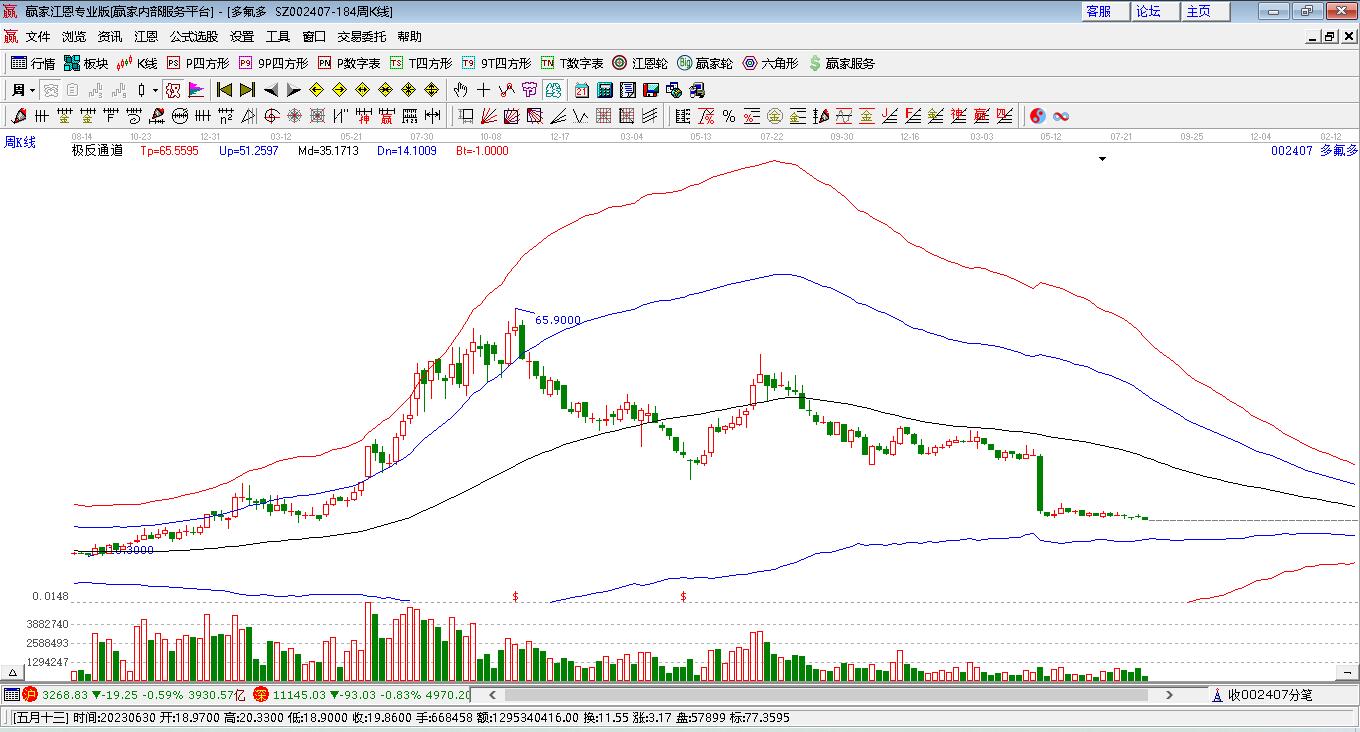 002407多氟多處于贏家江恩多頭中期回調形態(tài),今日雖重心上移,但短期空頭趨勢未改變,6月30日發(fā)出中期江恩筑底信號后,經過196日,今日形成中期筑頂信號,若持續(xù)下跌,觸發(fā)長期筑頂信號,002407多