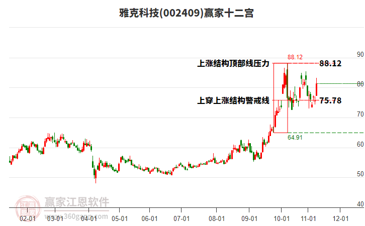 依據(jù)贏家江恩系統(tǒng)趨勢工具極反通道分析判斷雅克科技002409運行在生命線以上強勢區(qū)域,根據(jù)規(guī)則該股可短線、波段結(jié)合操作;結(jié)合物極必反的原理通過分鐘圖做盤中差價,應(yīng)用口訣是:生命線上強勢走,生命線下難抬頭;紅黃兩條外軌線,壓力支撐顯勢頭。