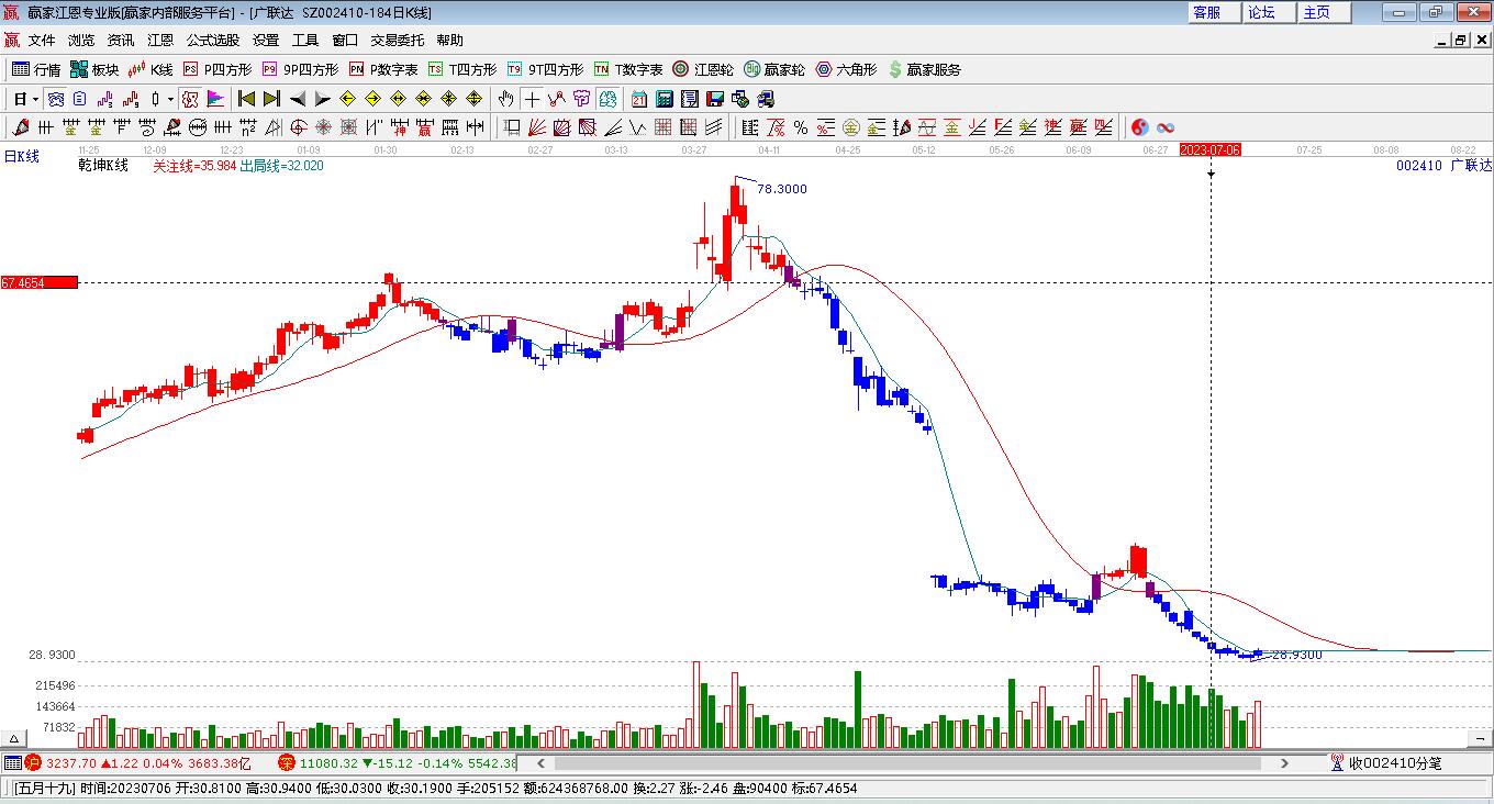 002410廣聯(lián)達(dá)根據(jù)贏家江恩極反通道趨勢(shì)工具展示,上方壓力位13.7154,下方支撐位11.6704。002410廣聯(lián)達(dá)處于贏家江恩空頭主線形態(tài),今日形成短期筑頂信號(hào),短期多頭趨勢(shì)已被破壞,中期多頭