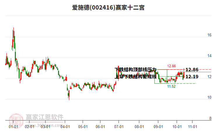 愛施德(002416)處于贏家江恩空頭中期反彈形態(tài),11月7日發(fā)出江恩筑頂信號后,經(jīng)過24日,今日再次發(fā)出江恩底分型并發(fā)出江恩筑底信號,中長線均在空頭下跌趨勢中。愛施德(002416)根據(jù)贏家江恩極反