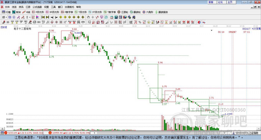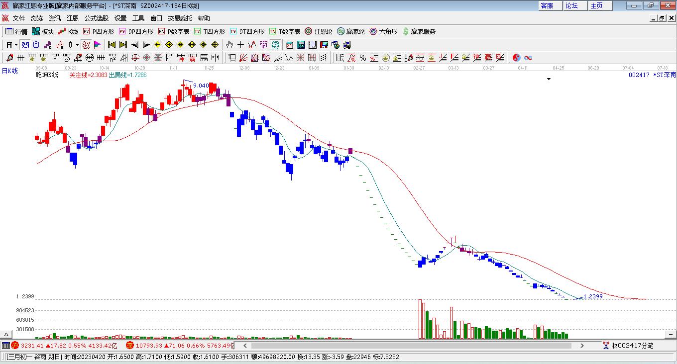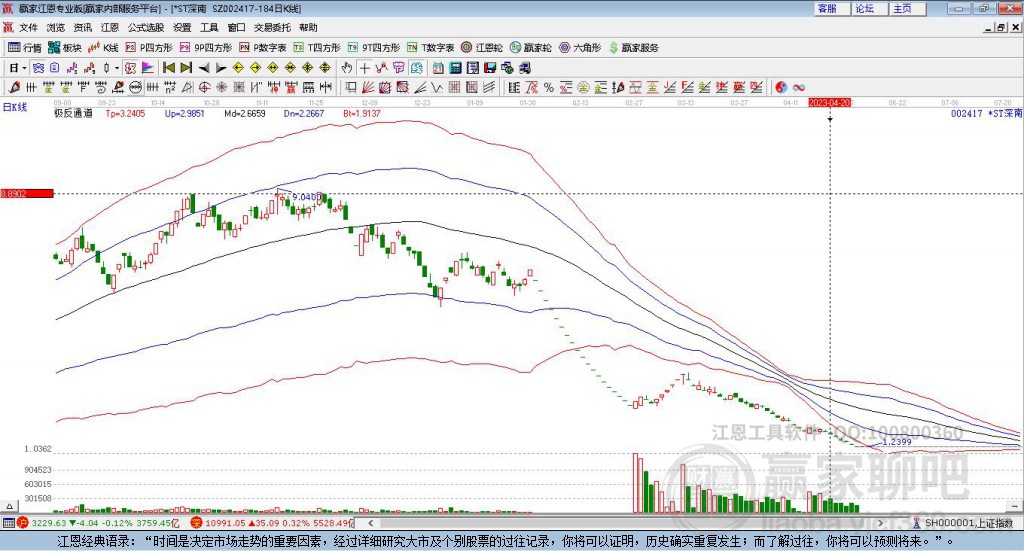依據(jù)贏家江恩系統(tǒng)趨勢工具極反通道分析判斷*ST深南002417運行在生命線以下弱勢區(qū)域,根據(jù)規(guī)則該股短線輕倉參與,股價跌至弱勢外軌線后波段再結(jié)合其它工具信號建倉。應(yīng)用口訣是:生命線上強勢走,生命線下難抬頭;紅黃兩條外軌線,壓力支撐顯勢頭。