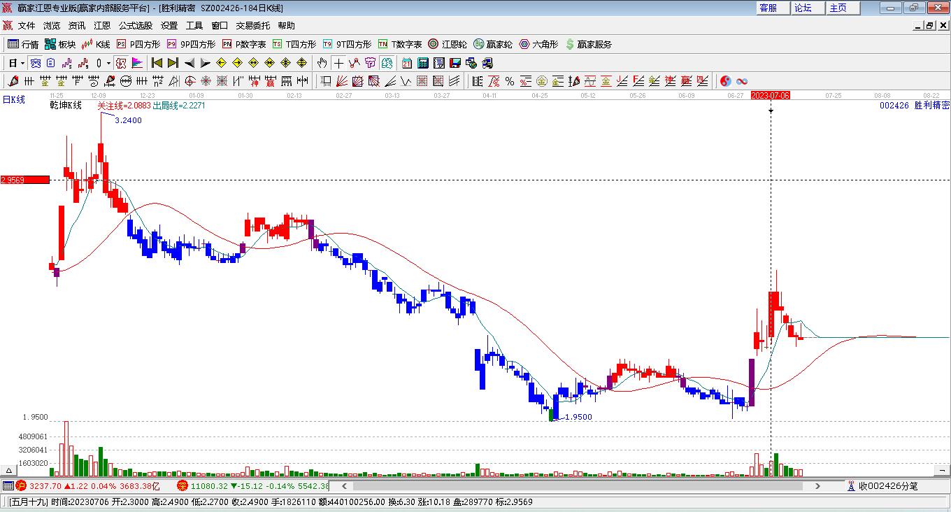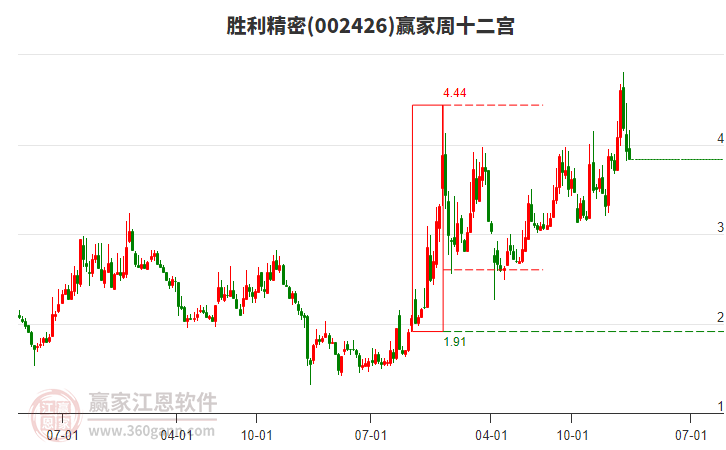 002426勝利精密處于贏家江恩多頭次主線形態(tài),12月26日發(fā)出江恩筑底信號后,經(jīng)過42日,今日形成短期筑頂信號,短期多頭趨勢已被破壞,中長期多頭趨勢依舊保持。002426勝利精密根據(jù)贏家江恩極反通道