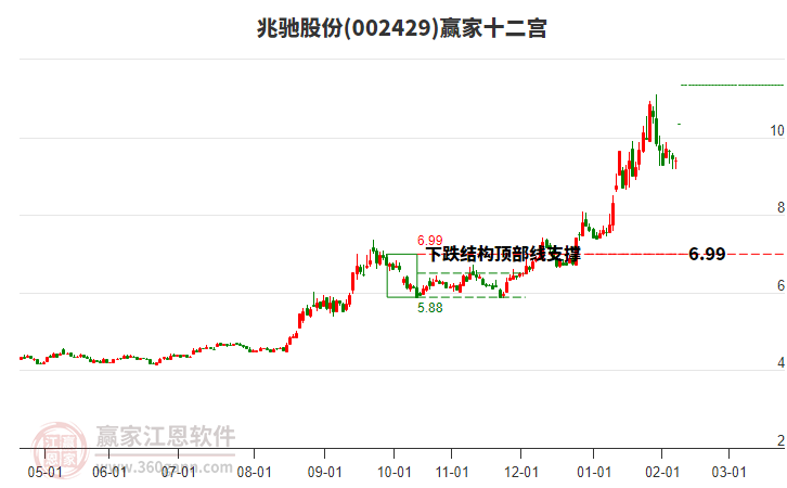 當(dāng)天兆馳股份002429最高價(jià)9.88上穿了贏家極反通道工具上方紅色外軌線,受到上方紅色外軌線強(qiáng)力壓制,最終收盤停留在在上方紅色外軌線與藍(lán)色外軌線上方的超強(qiáng)通道區(qū)域。兆馳股份002429近10個(gè)交易日