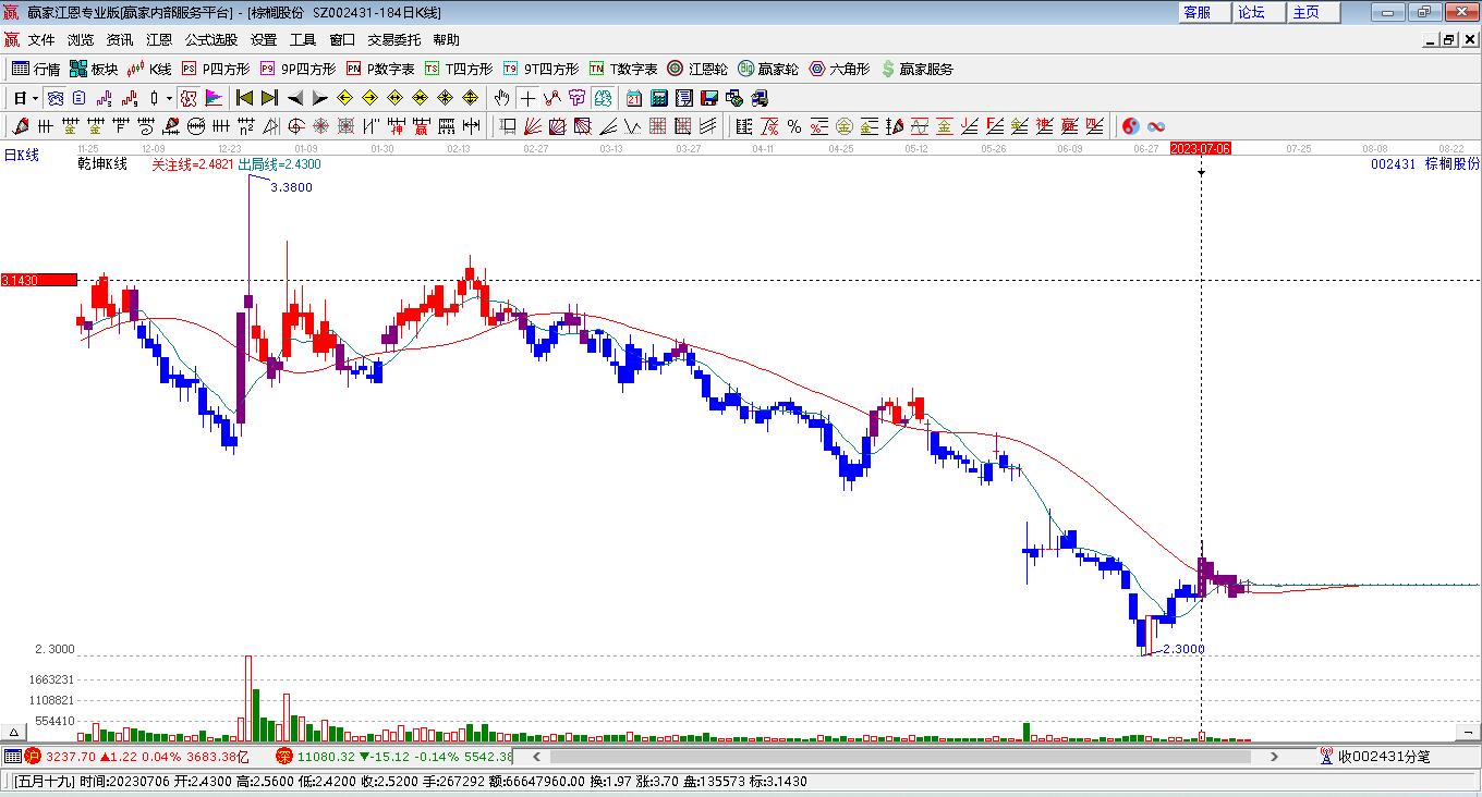 今天棕櫚股份漲停,到達(dá)黃金價(jià)格回調(diào)支撐位工具壓力位3.0元下