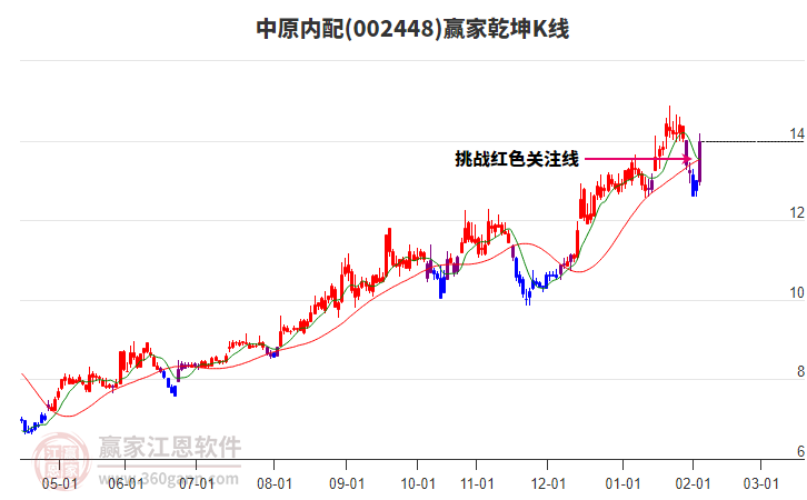 中原內(nèi)配低開收穿頭破腳大陽線,進(jìn)入乾坤K線紫色多空爭奪期