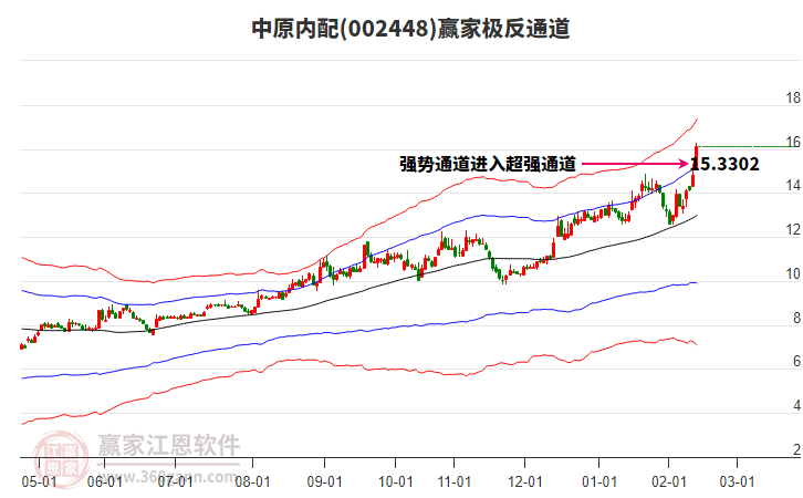 2月11日中原內(nèi)配最高價(jià)15.3挑戰(zhàn)了贏家極反通道工具藍(lán)色外軌線,受到藍(lán)色外軌線強(qiáng)力壓制,最終收盤停留在在藍(lán)色外軌線與生命線上方的強(qiáng)勢(shì)通道區(qū)域。中原內(nèi)配近10個(gè)交易日漲幅5.48%。