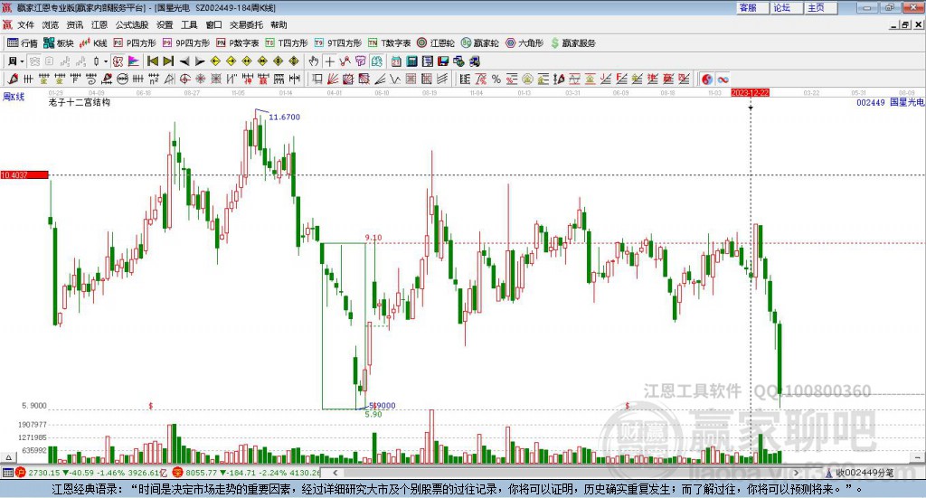 國(guó)星光電處于贏家江恩空頭中期反彈形態(tài),從1月23日形成頂分型后持續(xù)下跌,重心下移,今日跌破前低形成短期初次筑頂信號(hào),短期多頭趨勢(shì)已被破壞,中長(zhǎng)線均在空頭下跌趨勢(shì)中。國(guó)星光電根據(jù)贏家江恩極反通道趨勢(shì)工具