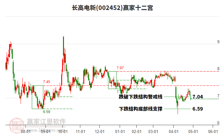 002452長高電新處于贏家江恩多頭次主線形態(tài),12月5日發(fā)出江恩筑底信號(hào)后,經(jīng)過12日,今日形成短期筑頂信號(hào),短期多頭趨勢已被破壞,中長期多頭趨勢依舊保持。002452長高電新根據(jù)贏家江恩極反通道趨
