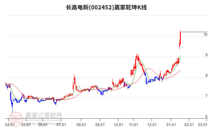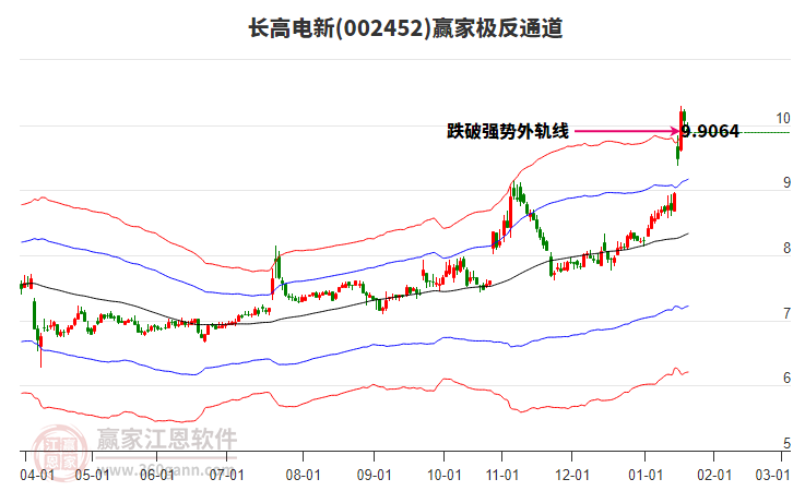 1月16日002452長高電新最高價(jià)9.85上穿了贏家極反通道工具上方紅色外軌線,受到上方紅色外軌線強(qiáng)力壓制,最終收盤停留在在上方紅色外軌線與藍(lán)色外軌線上方的超強(qiáng)通道區(qū)域。002452長高電新近10個(gè)