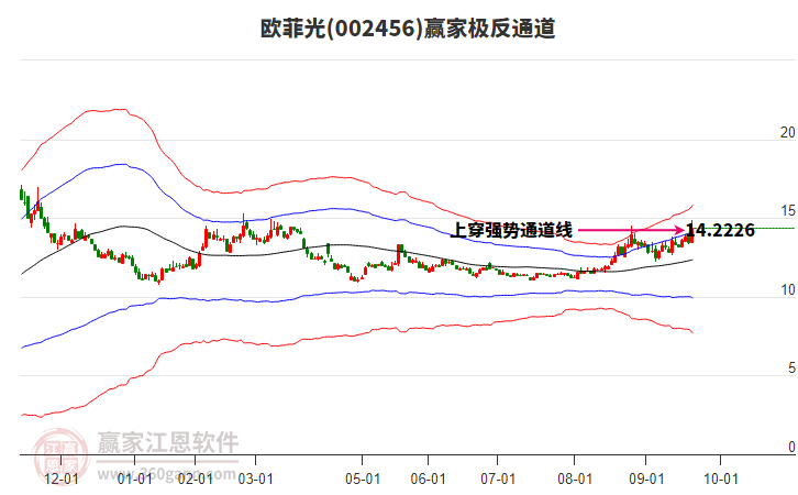 依據(jù)贏家江恩系統(tǒng)趨勢(shì)工具極反通道分析判斷歐菲光002456運(yùn)行在生命線以下弱勢(shì)區(qū)域,根據(jù)規(guī)則該股短線輕倉(cāng)參與,股價(jià)跌至弱勢(shì)外軌線后波段再結(jié)合其它工具信號(hào)建倉(cāng)。應(yīng)用口訣是:生命線上強(qiáng)勢(shì)走,生命線下難抬頭;紅黃兩條外軌線,壓力支撐顯勢(shì)頭。