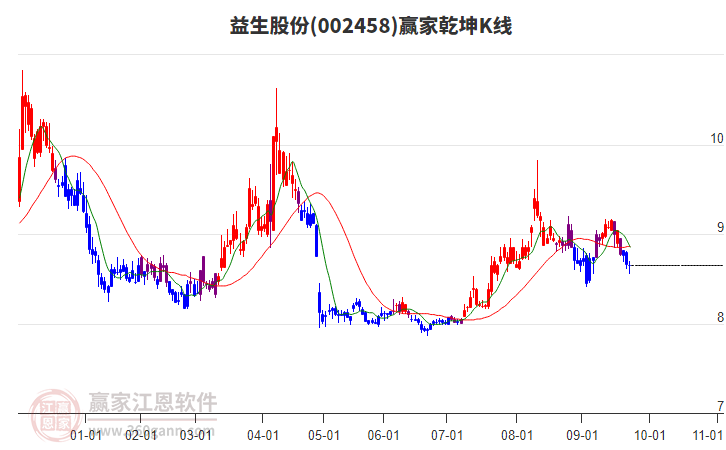 依據(jù)贏家江恩系統(tǒng)趨勢工具極反通道分析判斷益生股份002458運行在生命線以下弱勢區(qū)域,根據(jù)規(guī)則該股短線輕倉參與,股價跌至弱勢外軌線后波段再結(jié)合其它工具信號建倉。應用口訣是:生命線上強勢走,生命線下難抬頭;紅黃兩條外軌線,壓力支撐顯勢頭。