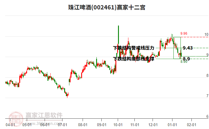 依據(jù)贏家江恩系統(tǒng)趨勢(shì)工具極反通道分析判斷珠江啤酒002461運(yùn)行在生命線以下弱勢(shì)區(qū)域,根據(jù)規(guī)則該股短線輕倉(cāng)參與,股價(jià)跌至弱勢(shì)外軌線后波段再結(jié)合其它工具信號(hào)建倉(cāng)。應(yīng)用口訣是:生命線上強(qiáng)勢(shì)走,生命線下難抬頭;紅黃兩條外軌線,壓力支撐顯勢(shì)頭。