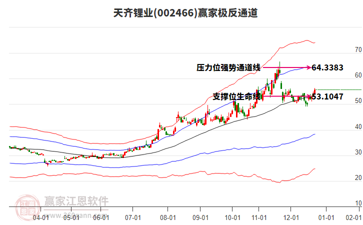 依據(jù)贏家江恩系統(tǒng)趨勢(shì)工具極反通道分析判斷天齊鋰業(yè)002466運(yùn)行在生命線以下弱勢(shì)區(qū)域,根據(jù)規(guī)則該股短線輕倉(cāng)參與,股價(jià)跌至弱勢(shì)外軌線后波段再結(jié)合其它工具信號(hào)建倉(cāng)。應(yīng)用口訣是:生命線上強(qiáng)勢(shì)走,生命線下難抬頭;紅黃兩條外軌線,壓力支撐顯勢(shì)頭。