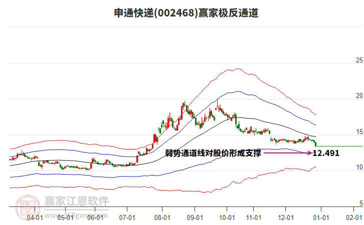 申通快遞處于贏家江恩多頭主線形態(tài),12月29日發(fā)出江恩筑頂信號后,經(jīng)過22日,今日再次發(fā)出江恩底分型并發(fā)出江恩筑底信號,中長期目前都處于回調(diào)中。申通快遞根據(jù)贏家江恩極反通道趨勢工具展示,上方壓力位14