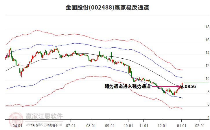 1月12日金固股份002488最高價(jià)12.21上穿了贏家極反通道工具上方紅色外軌線,受到上方紅色外軌線強(qiáng)力壓制,最終收盤停留在在上方紅色外軌線與藍(lán)色外軌線上方的超強(qiáng)通道區(qū)域。金固股份002488近10