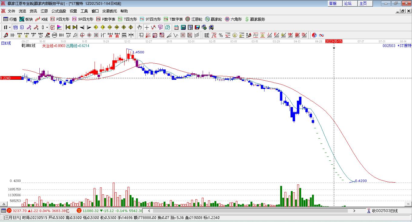 搜于特002503今日今日大幅跳空低開,相較于昨日股價下跌0.04元至今日收盤:0.68元/股,跌幅5.56%,今日形成的今天處于“贏家江恩軟件”極反通道工具下方紅色外軌線下方區(qū)域,搜于特002503