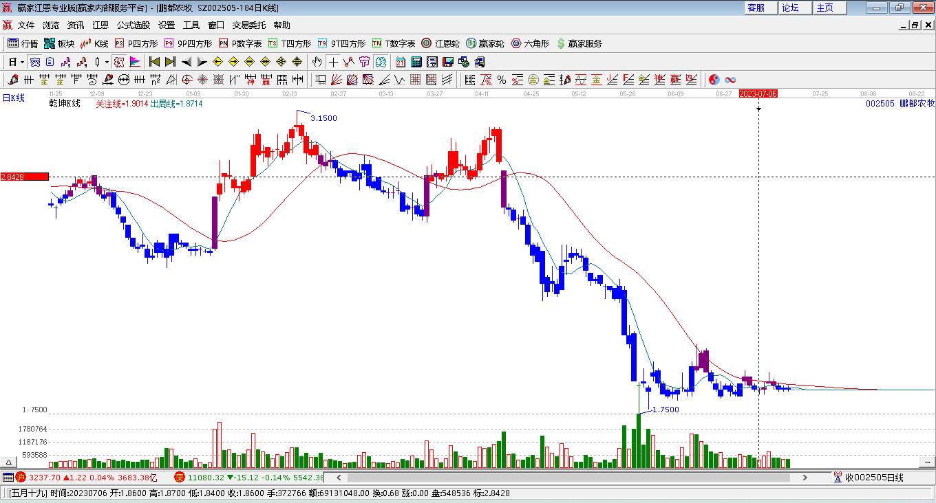 002505鵬都農牧近期高點1.0持續(xù)下跌,漲幅回落21.95%,目前處于下跌趨勢