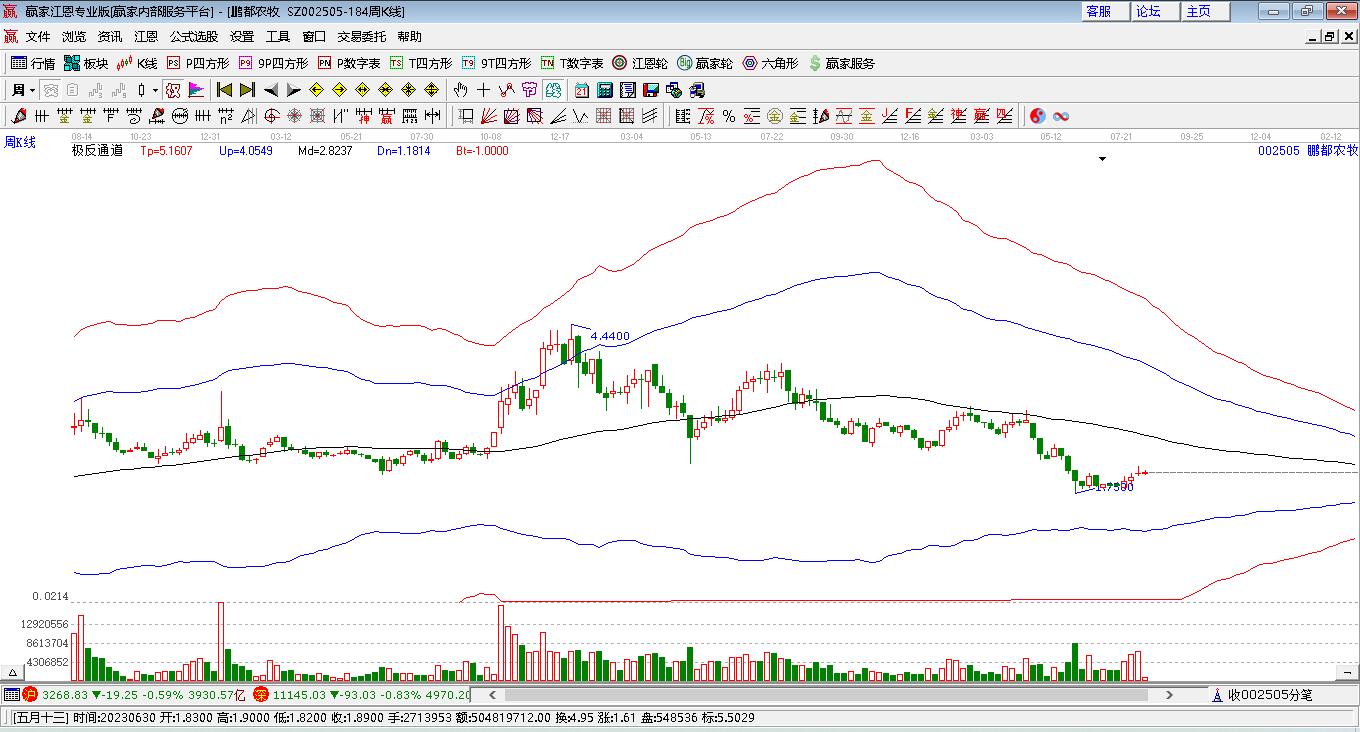 依據贏家江恩極反通道趨勢工具展示,本周跌破弱勢通道線,由弱勢通道進入超弱通道,本次下跌自11月10日跌至本周已經持續(xù)了32周,跌幅372.73%,依據極反通道規(guī)則,失守一線,看低一線。后市股價若不能快速收復該位置,則密切注意下方超弱外軌線-0.4777,若能快速反彈,則有望收復該位置,并向上方生命線位置發(fā)起挑戰(zhàn)。