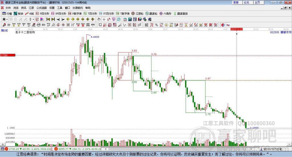 依據贏家江恩輪中輪價格模型工具展示,本周K線大跌40.54%,自近期高點2.08開始下跌,持續(xù)32周,跌幅達372.73%,目前處于贏家江恩輪中輪三角形0.44點上方。依據贏家江恩輪中輪規(guī)則,市場中三分位、四分位是一切市場周期運行的基礎。本周股價若站穩(wěn)三角形關鍵位置,則有望再次挑戰(zhàn)上方四方形關鍵位置0.84。若繼續(xù)向下跌破三角形關鍵位置0.44,將向下看至四方形關鍵支撐位0.24。