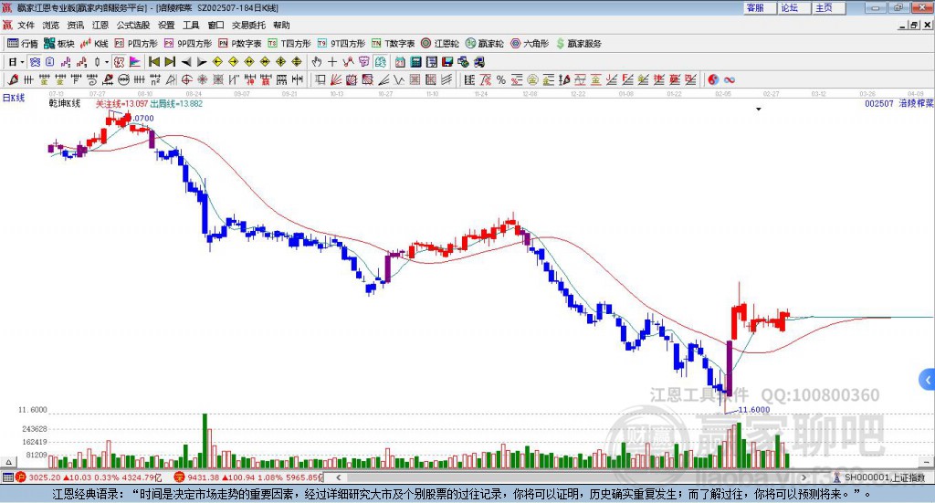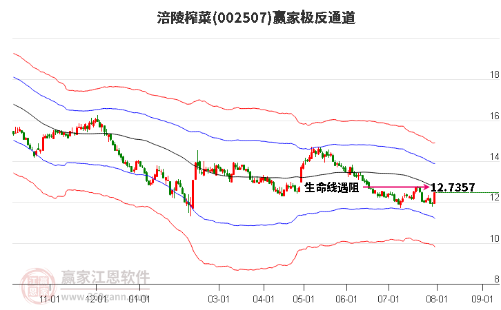 依據(jù)贏家江恩系統(tǒng)趨勢(shì)工具極反通道分析判斷涪陵榨菜002507運(yùn)行在生命線以下弱勢(shì)區(qū)域,根據(jù)規(guī)則該股短線輕倉(cāng)參與,股價(jià)跌至弱勢(shì)外軌線后波段再結(jié)合其它工具信號(hào)建倉(cāng)。應(yīng)用口訣是:生命線上強(qiáng)勢(shì)走,生命線下難抬頭;紅黃兩條外軌線,壓力支撐顯勢(shì)頭。