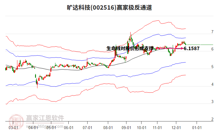 依據(jù)贏家江恩系統(tǒng)趨勢工具極反通道分析判斷曠達(dá)科技002516運行在生命線以下弱勢區(qū)域,根據(jù)規(guī)則該股短線輕倉參與,股價跌至弱勢外軌線后波段再結(jié)合其它工具信號建倉。應(yīng)用口訣是:生命線上強勢走,生命線下難抬頭;紅黃兩條外軌線,壓力支撐顯勢頭。