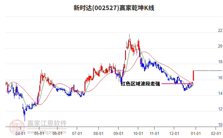 12月31日新時(shí)達(dá)002527最高價(jià)18.58上穿了贏家極反通道工具藍(lán)色外軌線,受到藍(lán)色外軌線強(qiáng)力壓制,最終收盤停留在在藍(lán)色外軌線與生命線上方的強(qiáng)勢(shì)通道區(qū)域。新時(shí)達(dá)002527近10個(gè)交易日漲幅18.