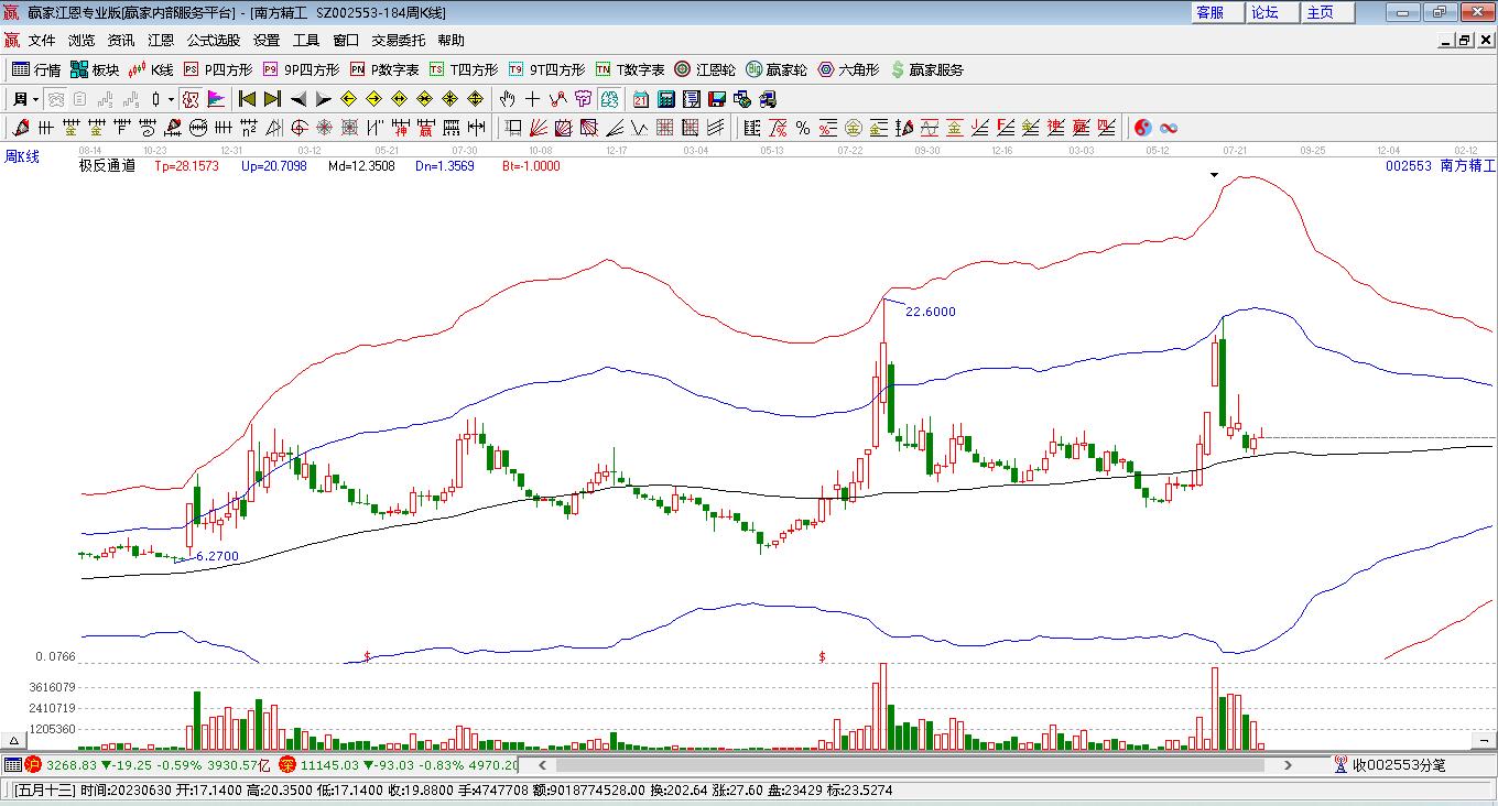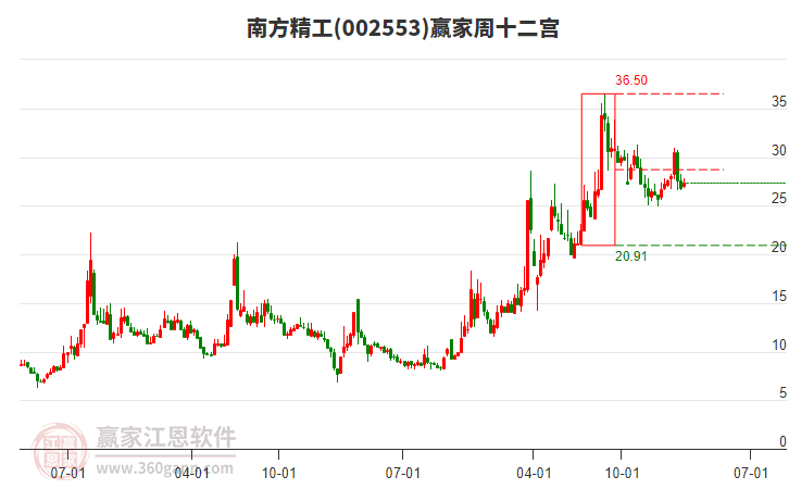 1月22日南方精工最高價30.25上穿了贏家極反通道工具藍色外軌線,受到藍色外軌線強力壓制,最終收盤停留在在藍色外軌線與生命線上方的強勢通道區(qū)域。南方精工近10個交易日漲幅8.3%。