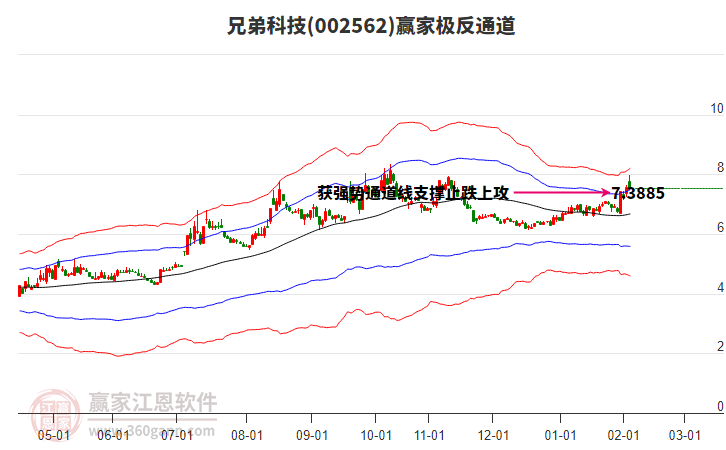 2月6日兄弟科技最高價(jià)8.01上穿了贏家極反通道工具藍(lán)色外軌線,受到藍(lán)色外軌線強(qiáng)力壓制,最終收盤停留在在藍(lán)色外軌線與生命線上方的強(qiáng)勢(shì)通道區(qū)域。兄弟科技近10個(gè)交易日漲幅4.09%。