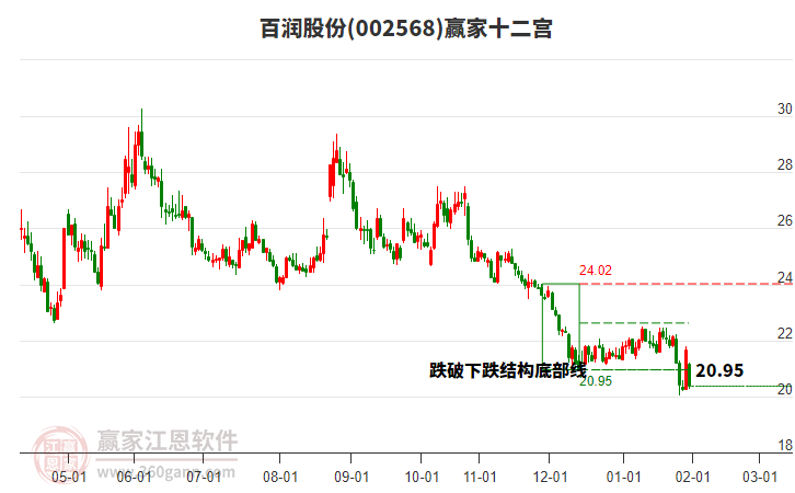 002568百潤股份從高點22.5,持續(xù)回調了14天,跌破贏家十二宮下跌結構底部線