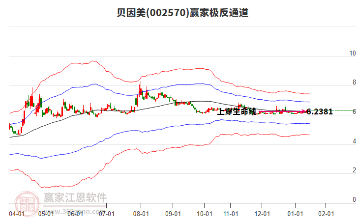 依據(jù)贏家江恩系統(tǒng)趨勢工具極反通道分析判斷貝因美002570運(yùn)行在生命線以下弱勢區(qū)域,根據(jù)規(guī)則該股短線輕倉參與,股價跌至弱勢外軌線后波段再結(jié)合其它工具信號建倉。應(yīng)用口訣是:生命線上強(qiáng)勢走,生命線下難抬頭;紅黃兩條外軌線,壓力支撐顯勢頭。