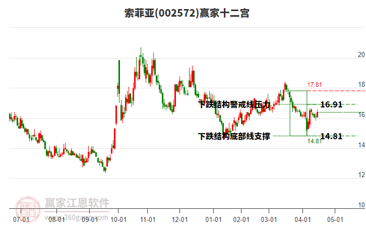 依據(jù)贏家江恩系統(tǒng)趨勢(shì)工具極反通道分析判斷索菲亞002572運(yùn)行在生命線以下弱勢(shì)區(qū)域,根據(jù)規(guī)則該股短線輕倉參與,股價(jià)跌至弱勢(shì)外軌線后波段再結(jié)合其它工具信號(hào)建倉。應(yīng)用口訣是:生命線上強(qiáng)勢(shì)走,生命線下難抬頭;紅黃兩條外軌線,壓力支撐顯勢(shì)頭。
