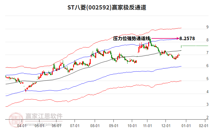 依據(jù)贏家江恩系統(tǒng)趨勢工具極反通道分析判斷ST八菱002592運行在生命線以上強勢區(qū)域,根據(jù)規(guī)則該股可短線、波段結(jié)合操作;結(jié)合物極必反的原理通過分鐘圖做盤中差價,應用口訣是:生命線上強勢走,生命線下難抬頭;紅黃兩條外軌線,壓力支撐顯勢頭。