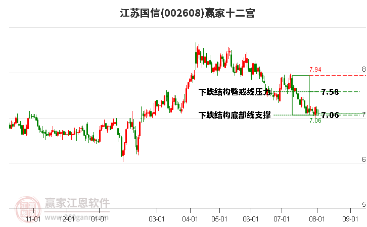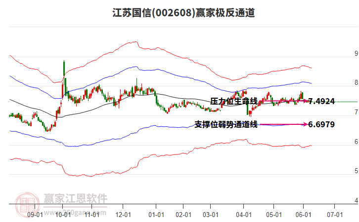依據贏家江恩系統(tǒng)趨勢工具極反通道分析判斷江蘇國信002608運行在生命線以下弱勢區(qū)域,根據規(guī)則該股短線輕倉參與,股價跌至弱勢外軌線后波段再結合其它工具信號建倉。應用口訣是:生命線上強勢走,生命線下難抬頭;紅黃兩條外軌線,壓力支撐顯勢頭。