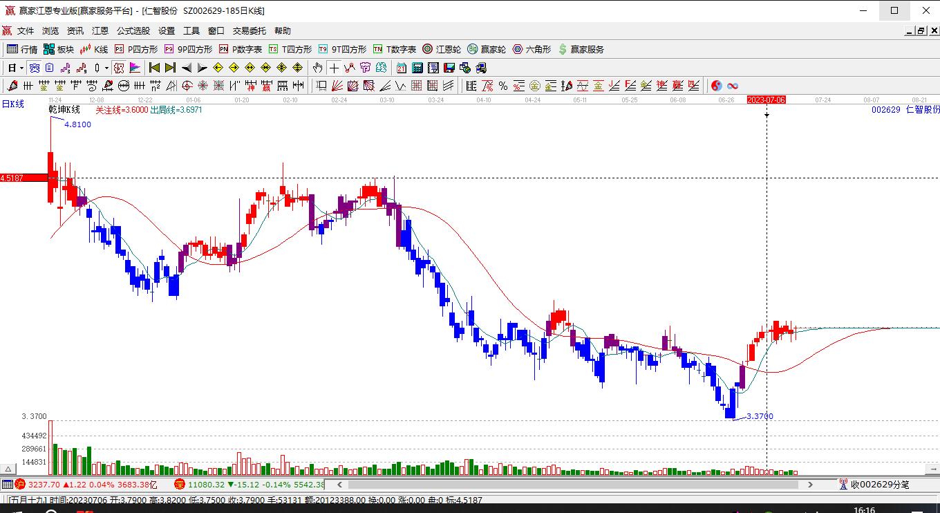 仁智股份(002629)目前漲停,與所屬行業(yè)概念下股票形成聯(lián)動效應。仁智股份(002629)截止目前短期反彈上穿波段百分比工具6.24元關鍵位,根據(jù)贏家江恩波段百分比工具展示,上方第一壓力位6.84,