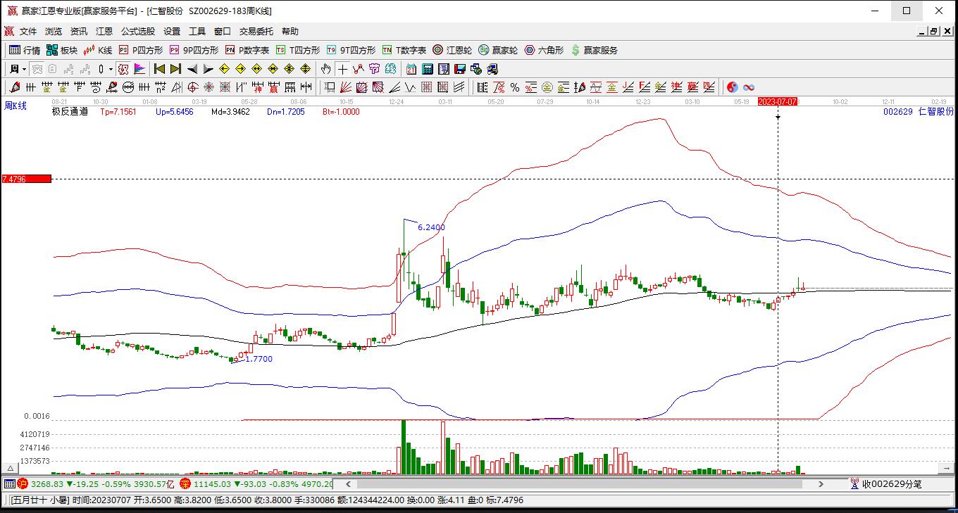仁智股份(002629)在高點7.95后,回調了1.83元,近期處于下跌趨勢