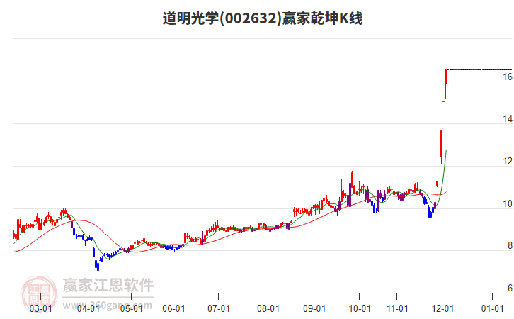 002632道明光學處于贏家江恩多頭次主線形態(tài),從1月12日形成頂分型后持續(xù)下跌,重心下移,今日跌破前低形成短期初次筑頂信號,短期多頭趨勢已被破壞,中期雖然處于回調中,但長期多頭趨勢延續(xù)。002632